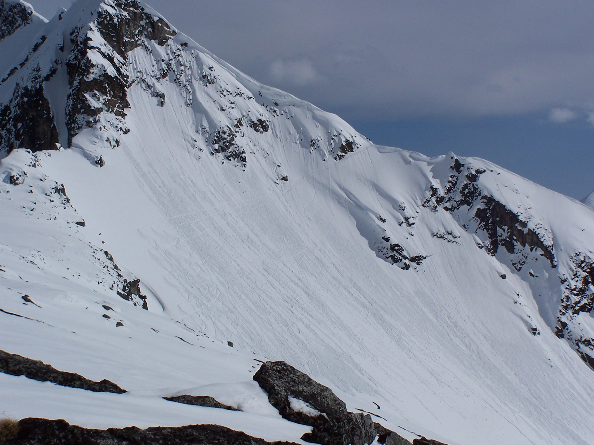 The ski descent was challenging but not scary, and we named this line White Chocolate Couloir (it is such a sweet ski line!). Given the post-trip info, one is tempted to call this Wrong Col, but that would just add to the confusion. The grid ref. for this col is 698414 at 8400 feet. The GR for the passage through the transverse ridge is about 695414.