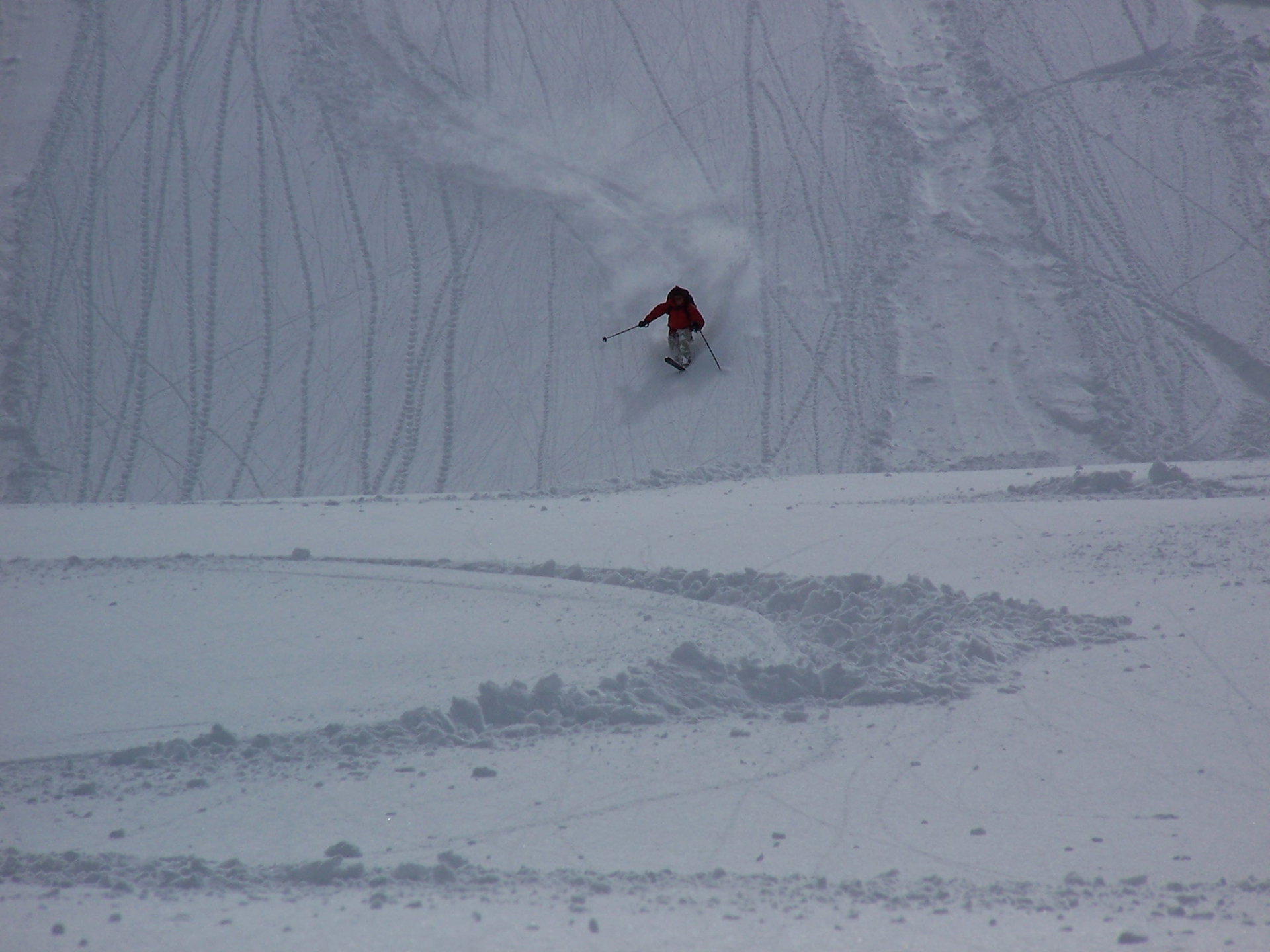 As often happens, the wind walls we built on this nice day were insufficient when the storm rolled in on the next day, with high winds, snow, and no visibility. We heard on the radio that the heli-skiers were shut down that day (Friday). But some of us really wanted to unravel the mysteries of (what we were taking to be) Never-Sun Col, so Bob, Rob, and I headed out into the murk to try to boot up the col to its top. Rob got to the base of it first and started to set steps. It was very steep terrain, measured at 52 degrees in spots by Bob, and over 50 for a long section. But the new snow was stable: despite the high winds causing some slab to form elsewhere, the wide couloir was protected from that, and the powder was good. Climbing the steps was hard work and with a heavy pack this would have been quite difficult. But the total length was only about 400 feet and it did not take too long. At the top it became clear that this col, which we could have (should have) reached the previous day, would have offered a fine route down. Heavy packs are little more than a nuisance when skiing in the same direction as gravity, and we were quite sure that, after checking for stability, we would have taken this route down had we made the col on the previous day. That would have been a very elegant line, though I would not suggest it in the opposite direction, as carrying a pack up the slope would be exhausting and take too long.